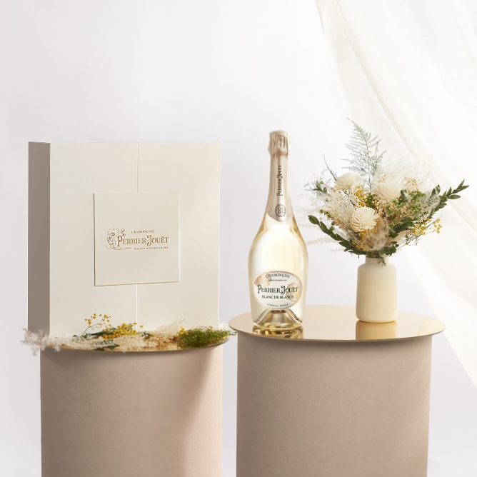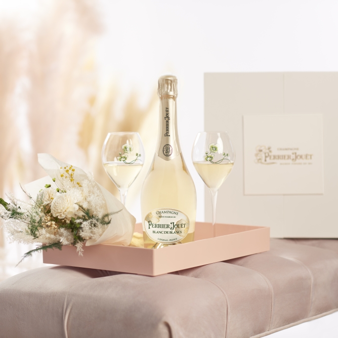 On behalf of Perrier-Jouët Champagne and East Olivia, we are thrilled to present a limited edition of our Classic Blanc de Blancs, inspired by all of the moments of love from a birth announcement or an engagement to the celebration of a wedding day. This gift set is the perfect match to congratulate the ones you love.